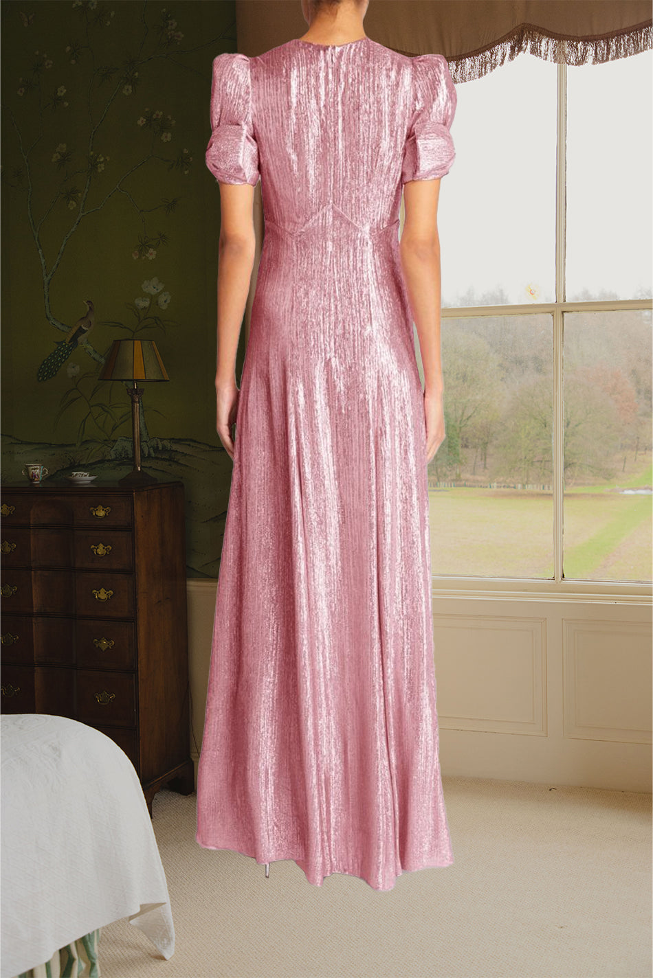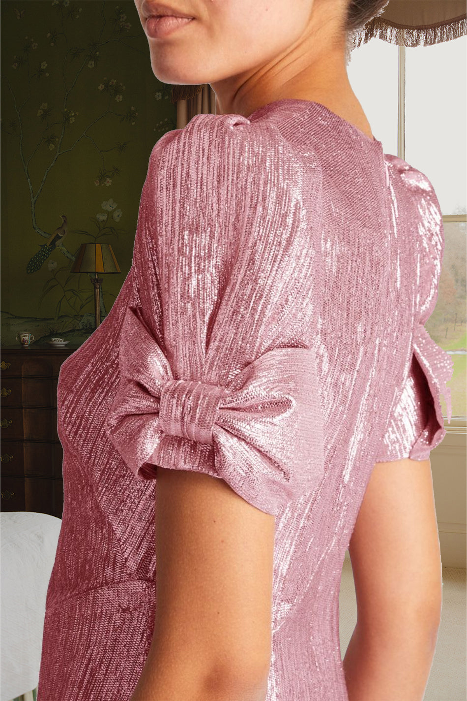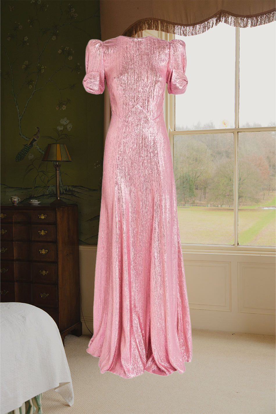Artfully cut from a dazzling bespoke pink metallic silk-lamé, The Poison Flower Dress is super-charged with old Hollywood glamour. Long line design with chevron bodice seaming, gathered puff sleeves embellished with an opulent bow. Centre back concealed zip closure. Lined with 100% silk crepe de chine.