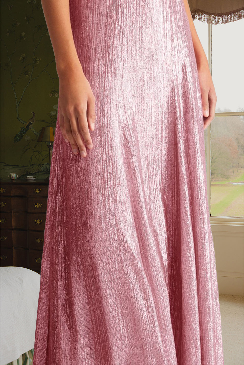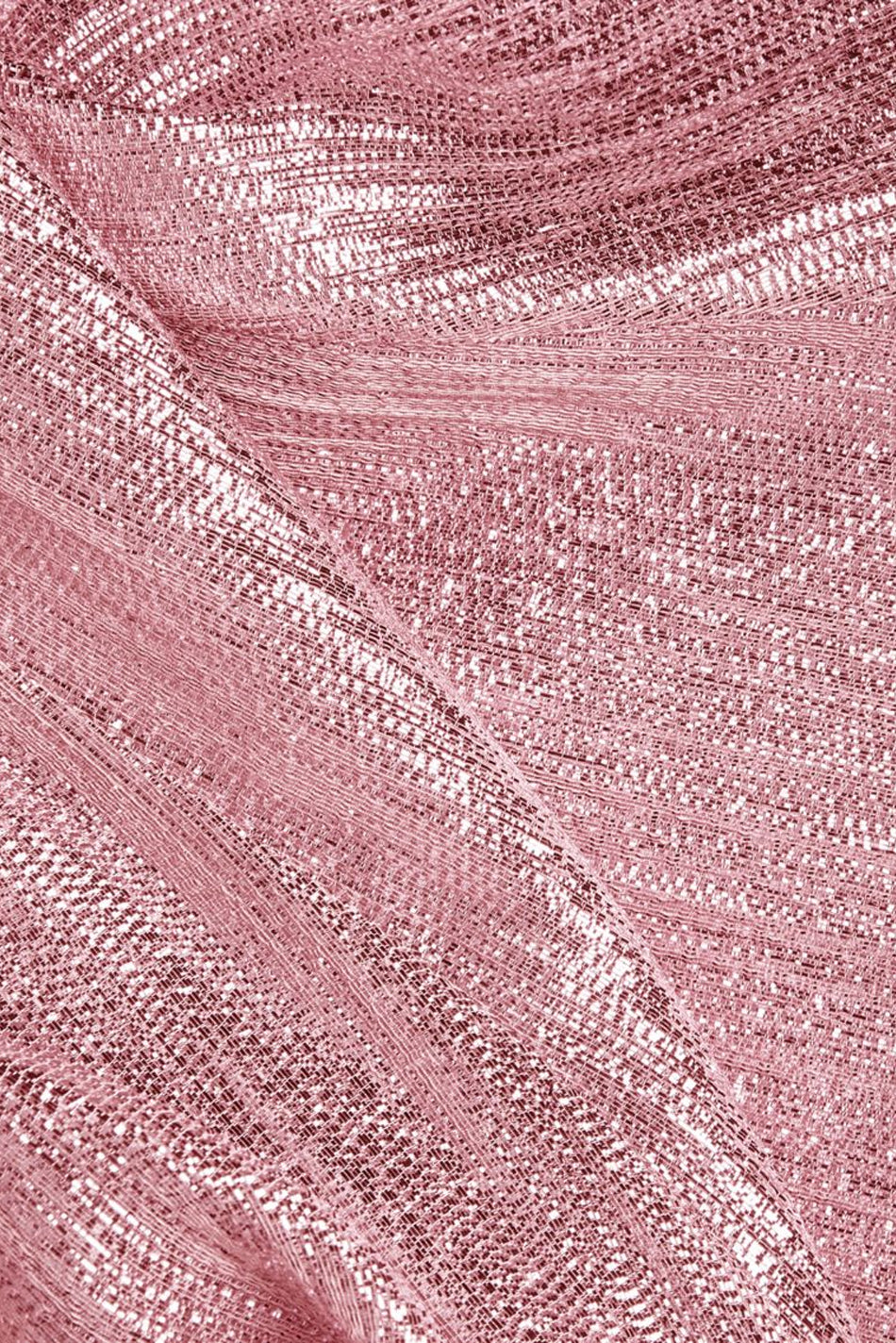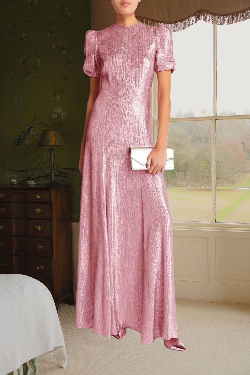 Artfully cut from a dazzling bespoke pink metallic silk-lamé, The Poison Flower Dress is super-charged with old Hollywood glamour. Long line design with chevron bodice seaming, gathered puff sleeves embellished with an opulent bow. Centre back concealed zip closure. Lined with 100% silk crepe de chine.