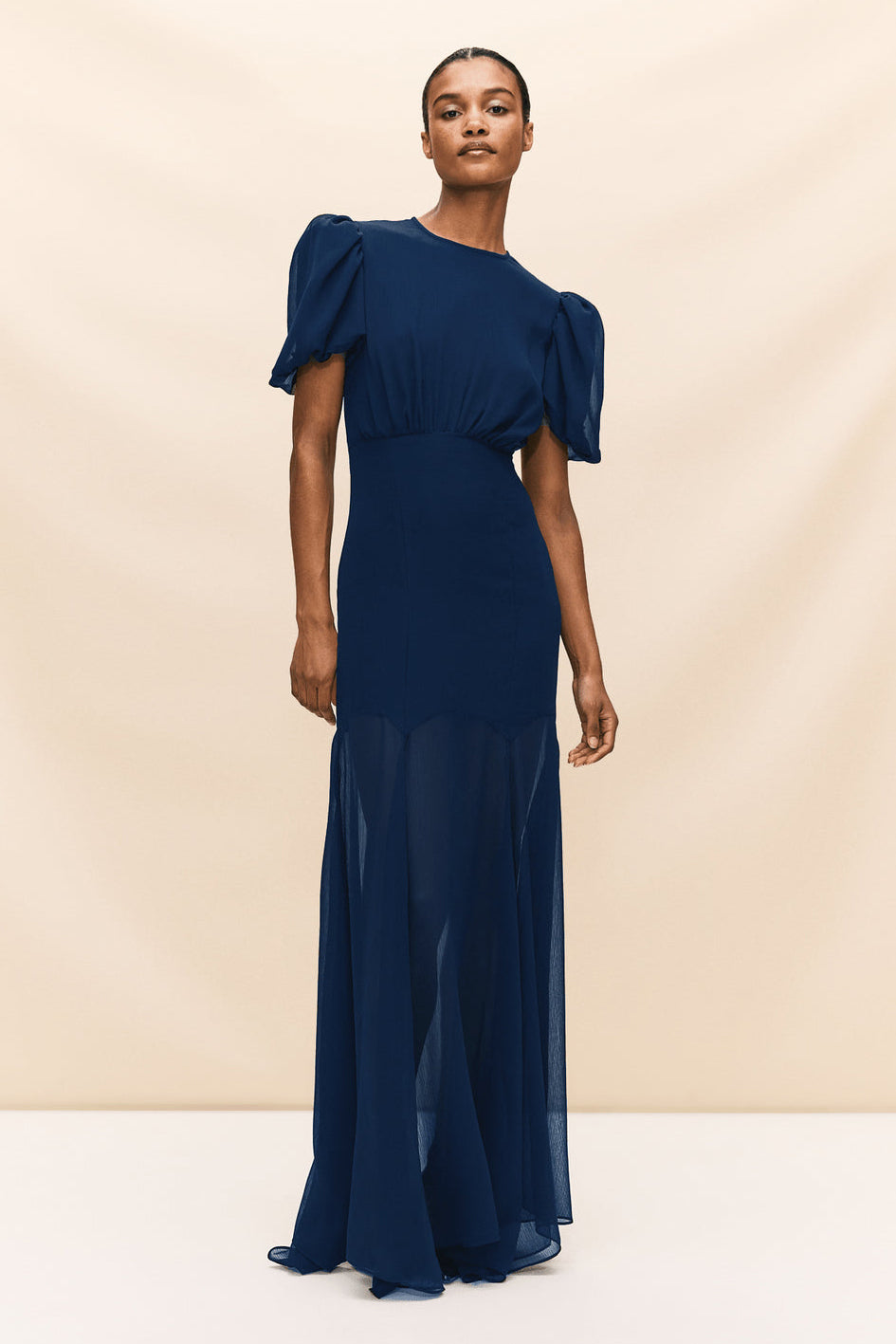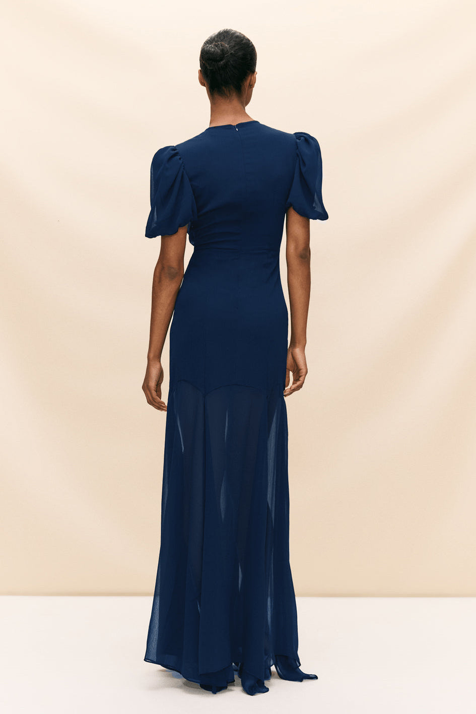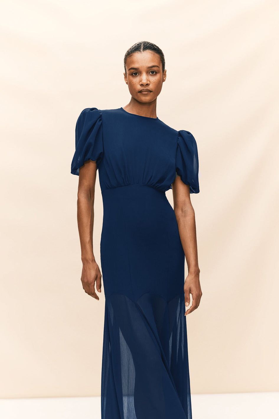 The Agua Maxi Dress in a perfect Navy crinkle chiffon showcases a true signature De La Vali gown. This lightweight chiffon maxi dress boasts a semi-fitted bodice with bust ruching, a fluid fishtail skirt in panels of semi sheer luxe fabric, and voluminous puff sleeves accented with internal organza ruffles to create a dramatic, feminine silhouette.