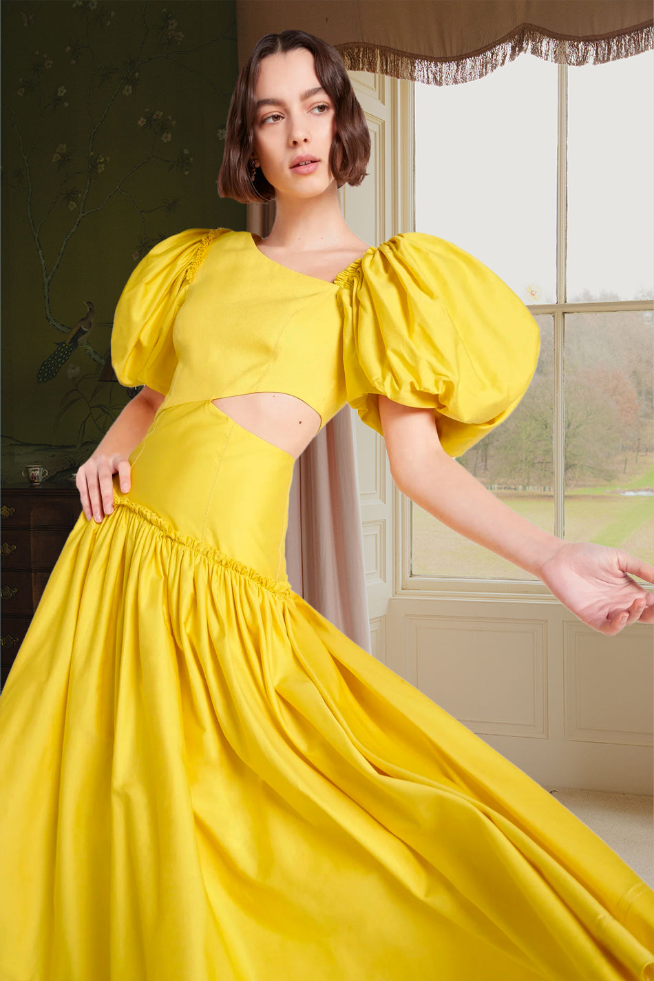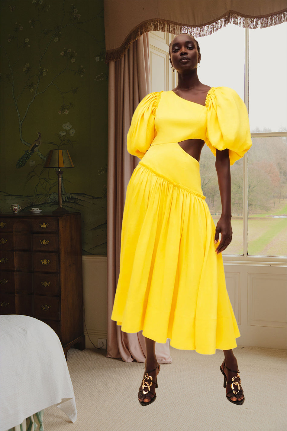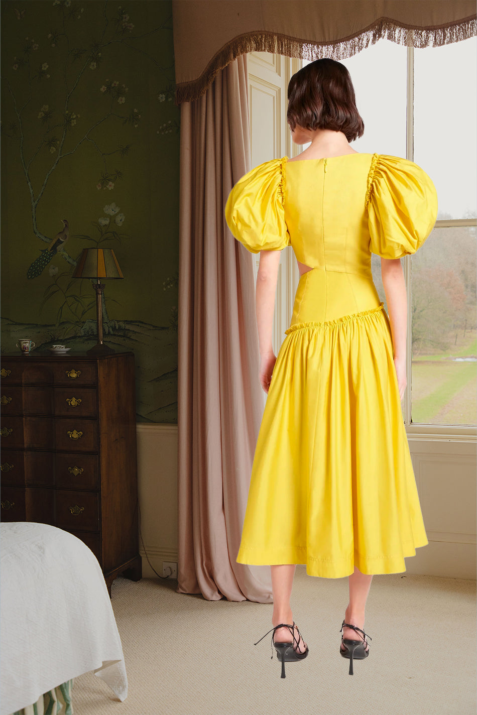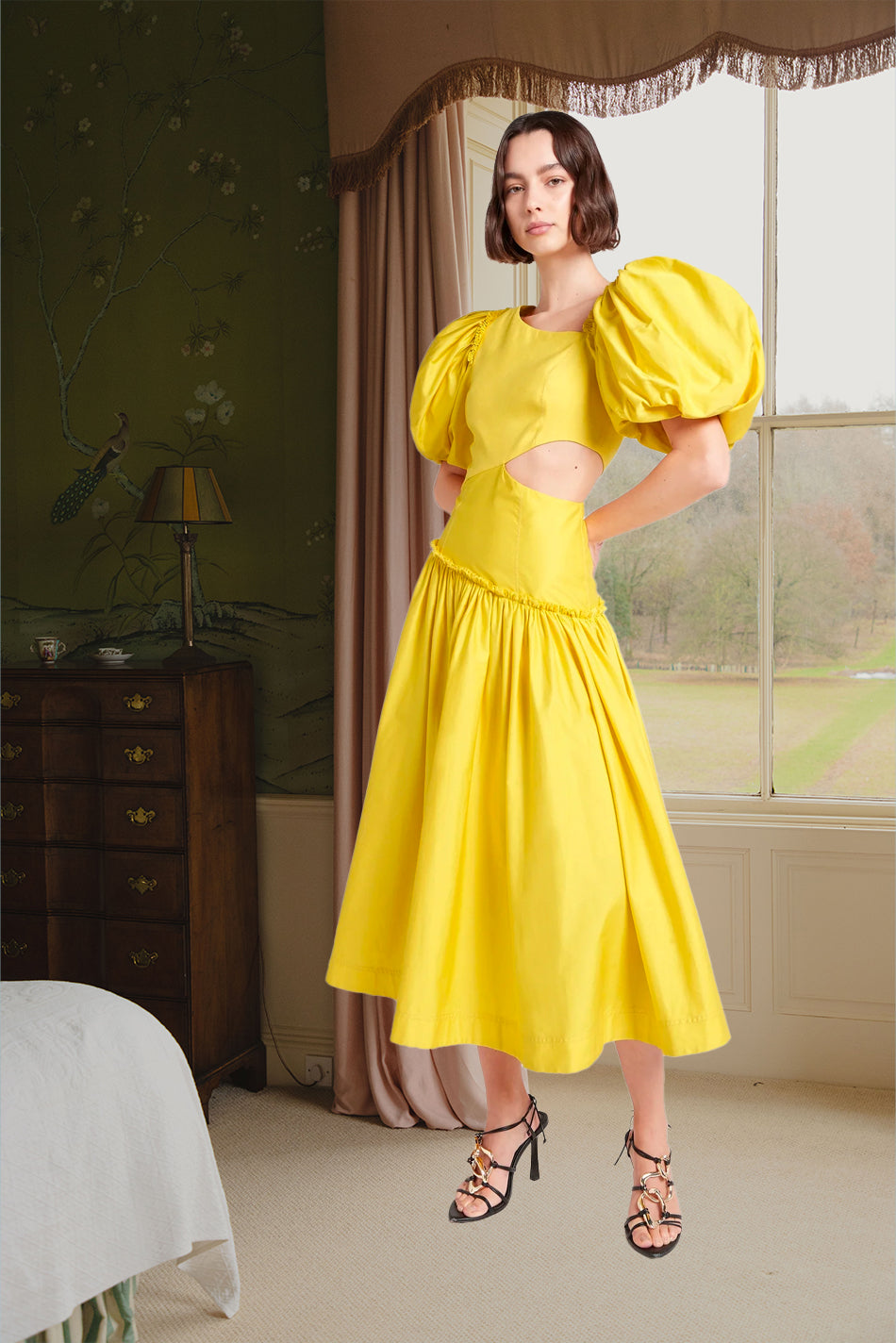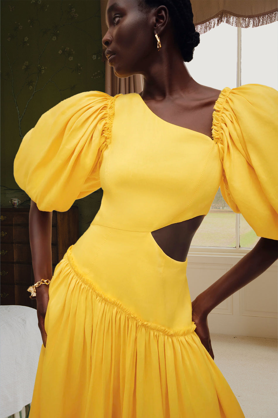 A creatively cut-out midi dress presenting a ruffled skirt, asymmetric detailing, signature Aje voluminous sleeves and exposed, raw cut seaming for a contemporary feminine finish. NB this dress has some marks - please get in touch for photos!