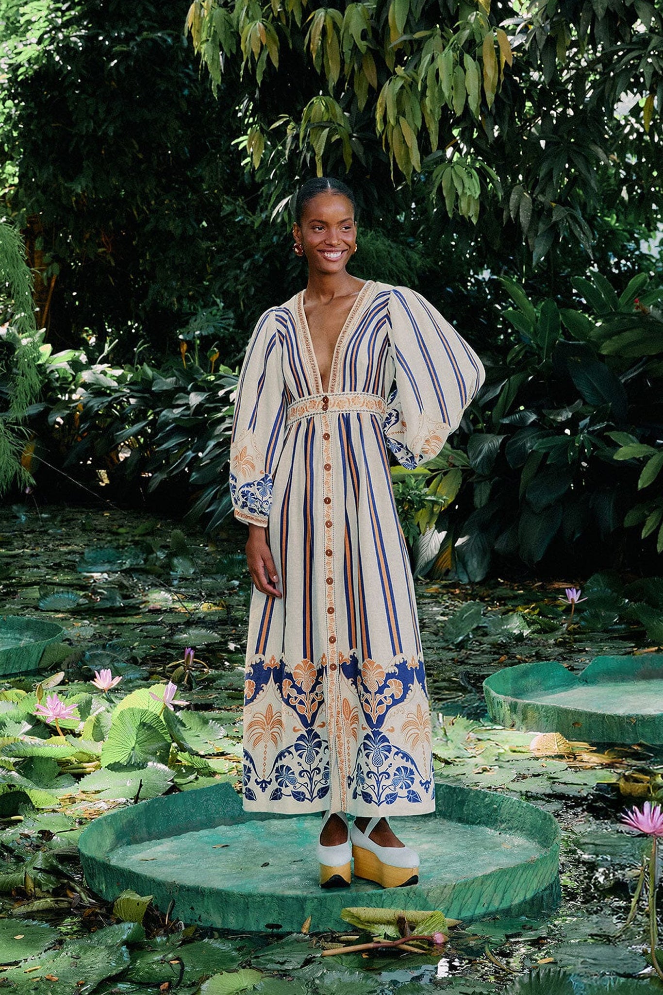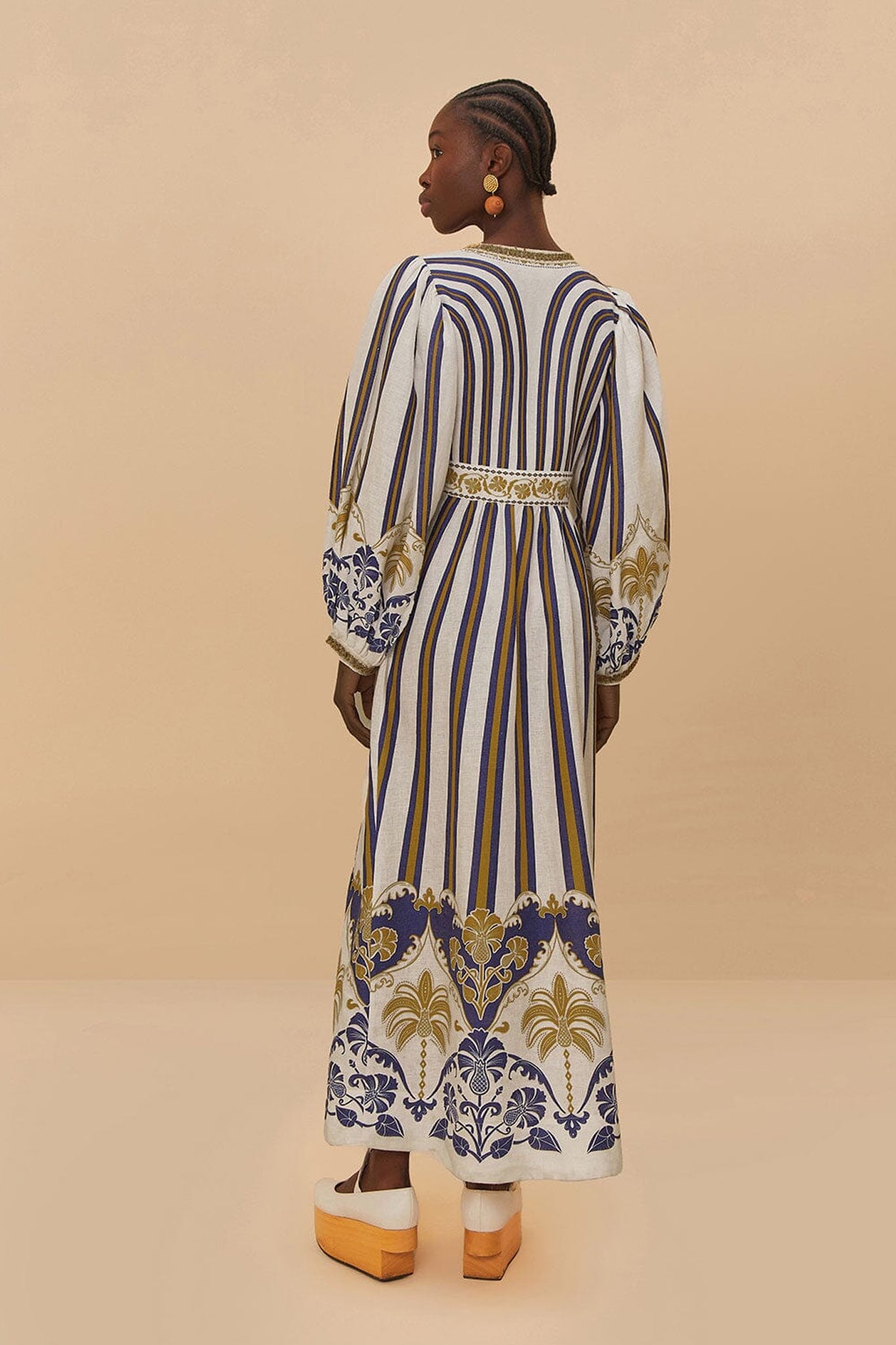 Step into elegance with the Off-White Pineapple Deco Maxi Dress by FARM Rio. Adorned with vibrant striped patterns and intricate pineapple motifs, this dress exudes a playful charm. The voluminous sleeves and V neckline add a flattering touch, while the cinched waist beautifully accentuates your silhouette. Crafted from responsible materials, it's a piece that combines artistry and conscious craftsmanship, inviting warmth and joy to any occasion. LENZING™ ECOVERO™: the eco-responsible fibers generate up to 50% lower emissions and water impact compared to generic viscose.