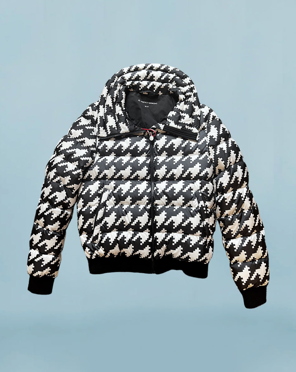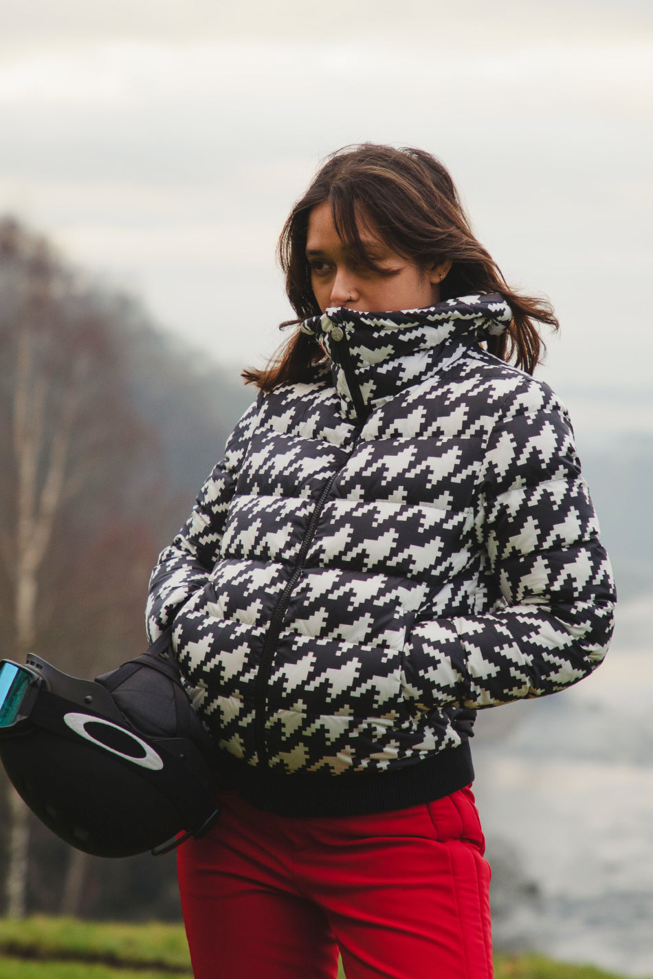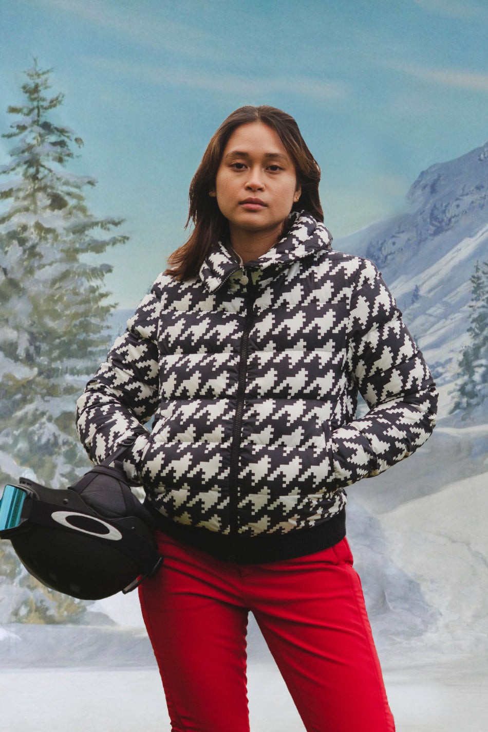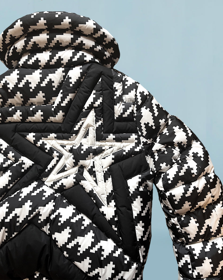 39% polyester, 35% acrylic, 20% nylon, 6% wool. Lining: 92% polyester, 8% spandex. Sleeve lining: 100% nylon. Fill: 90% goose down, 10% feather.