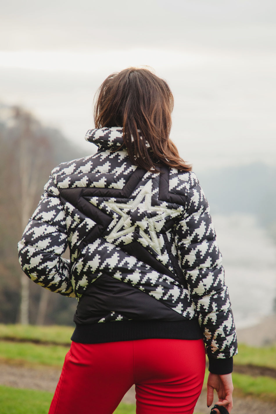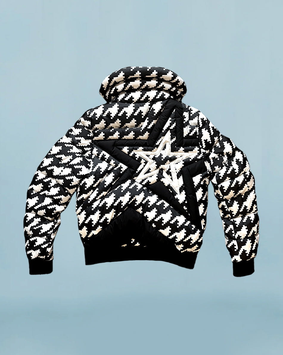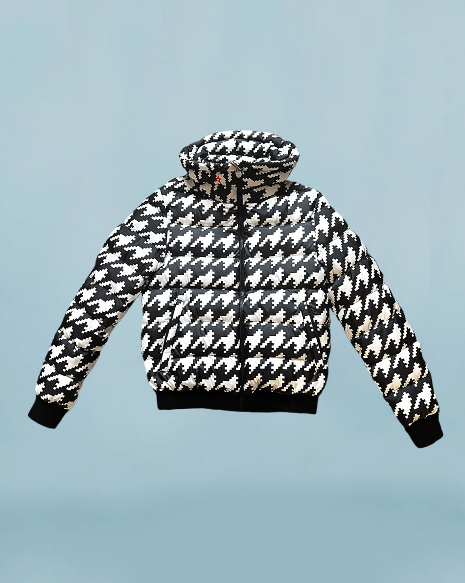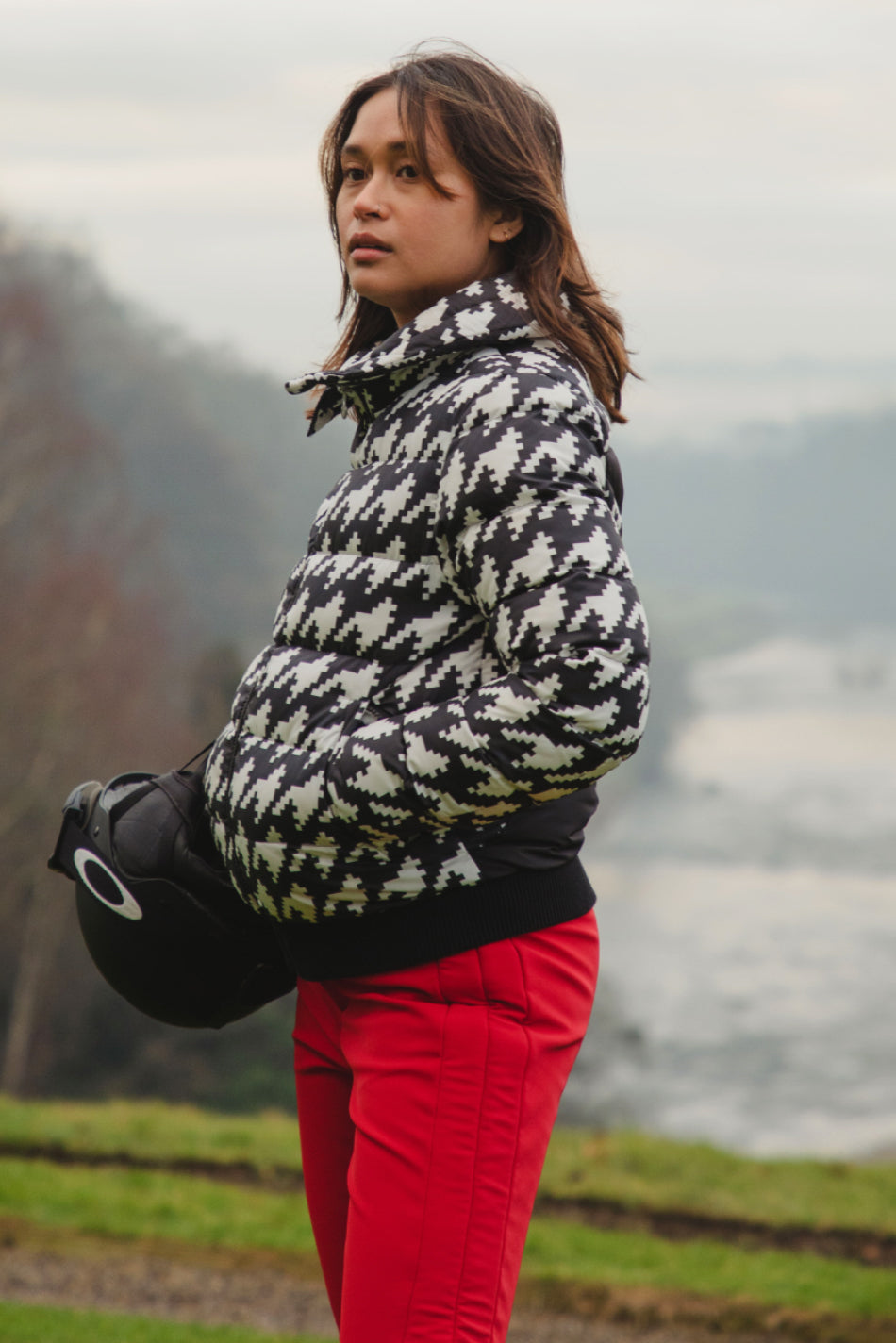 39% polyester, 35% acrylic, 20% nylon, 6% wool. Lining: 92% polyester, 8% spandex. Sleeve lining: 100% nylon. Fill: 90% goose down, 10% feather.