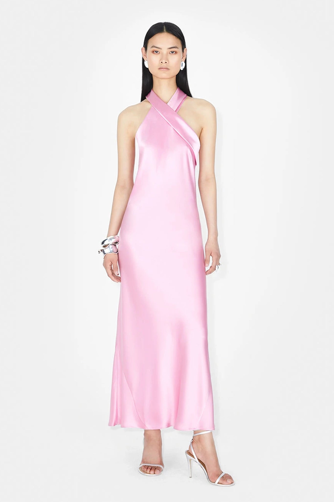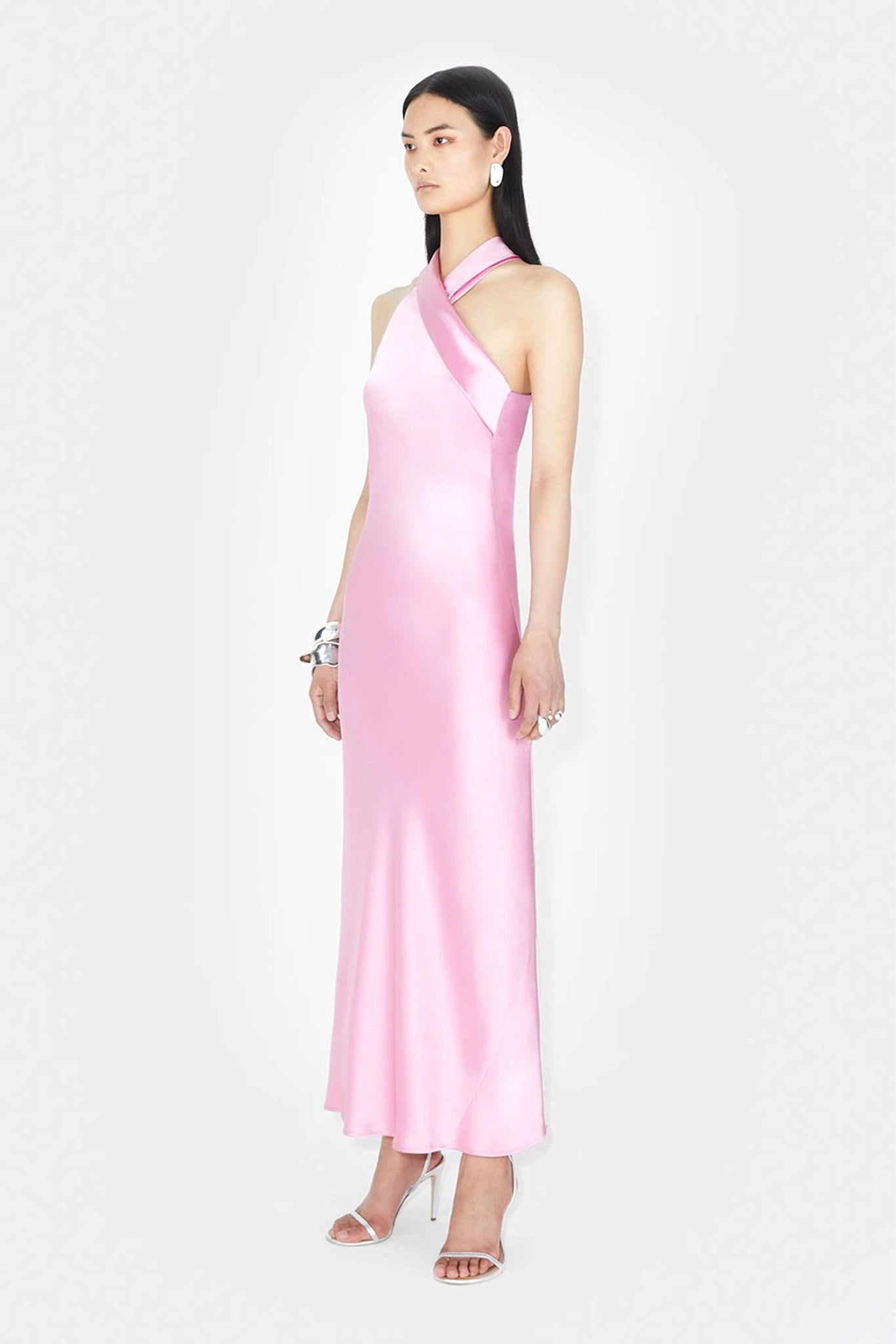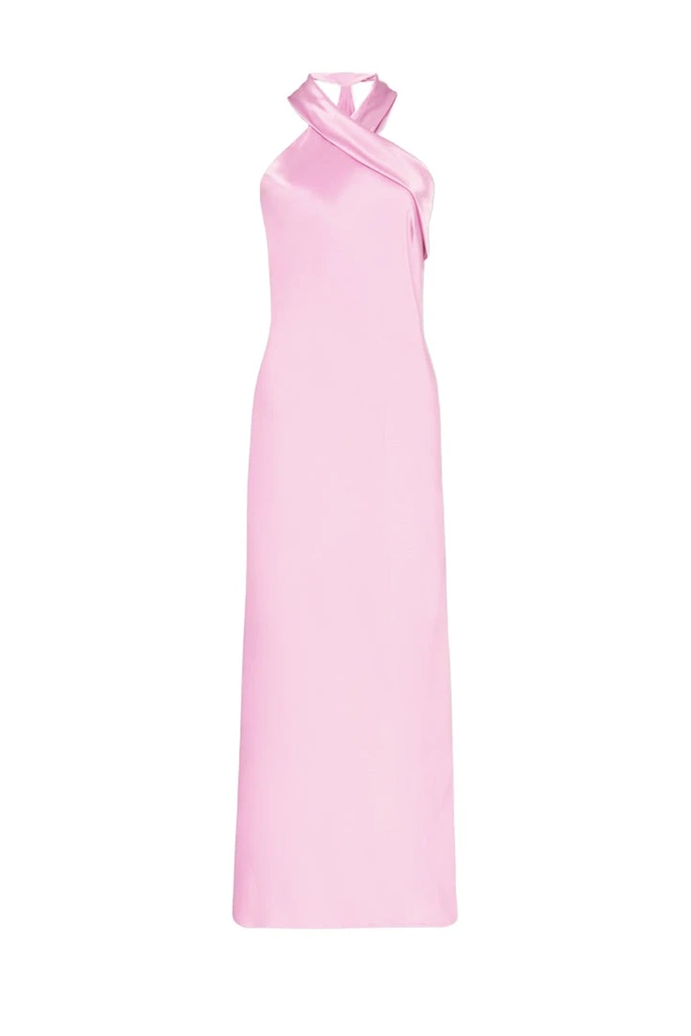 The Pandora gown is crafted from fluid satin and features a draping halter neckline