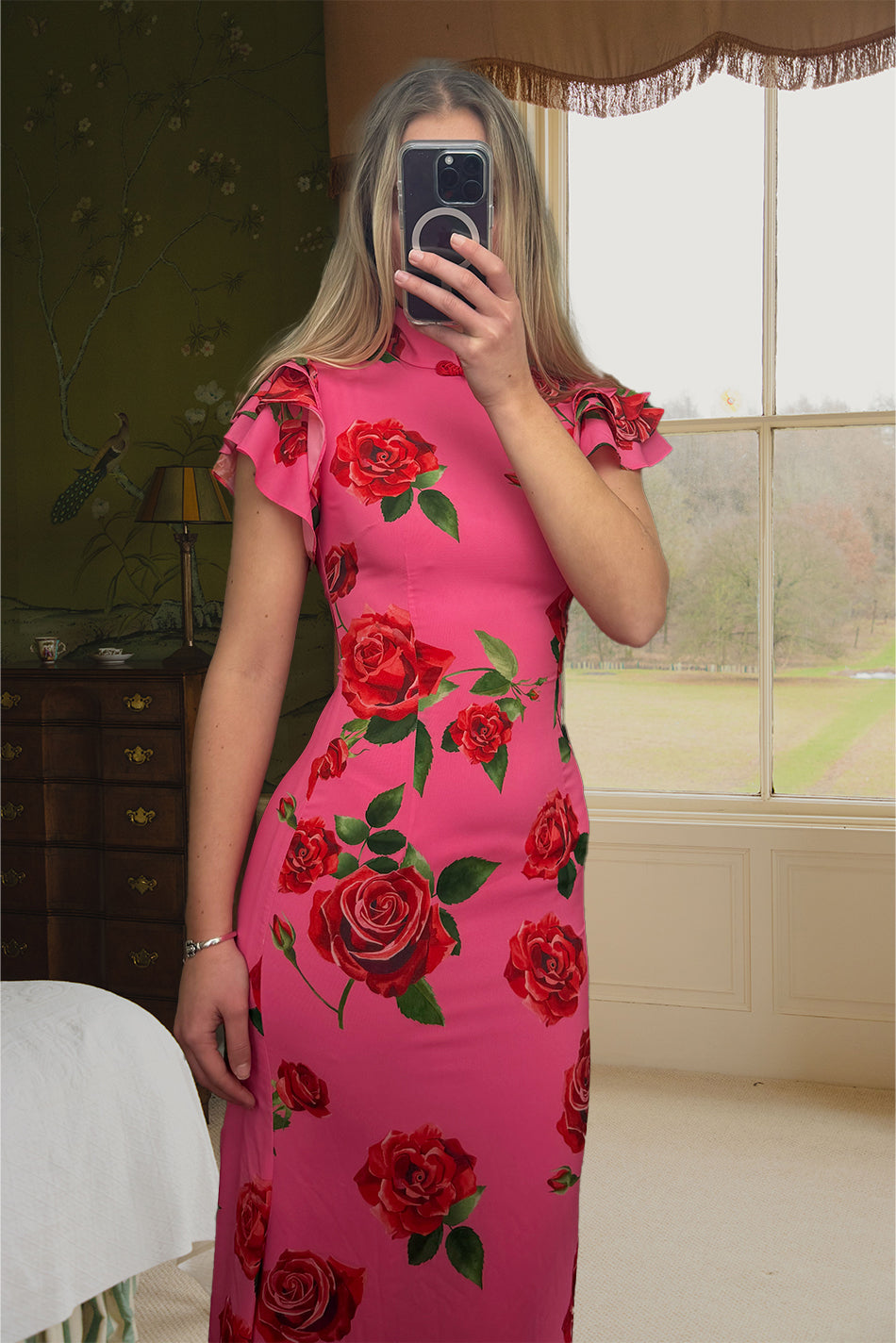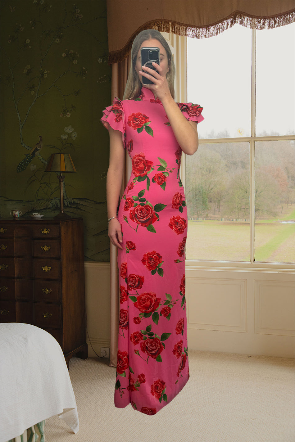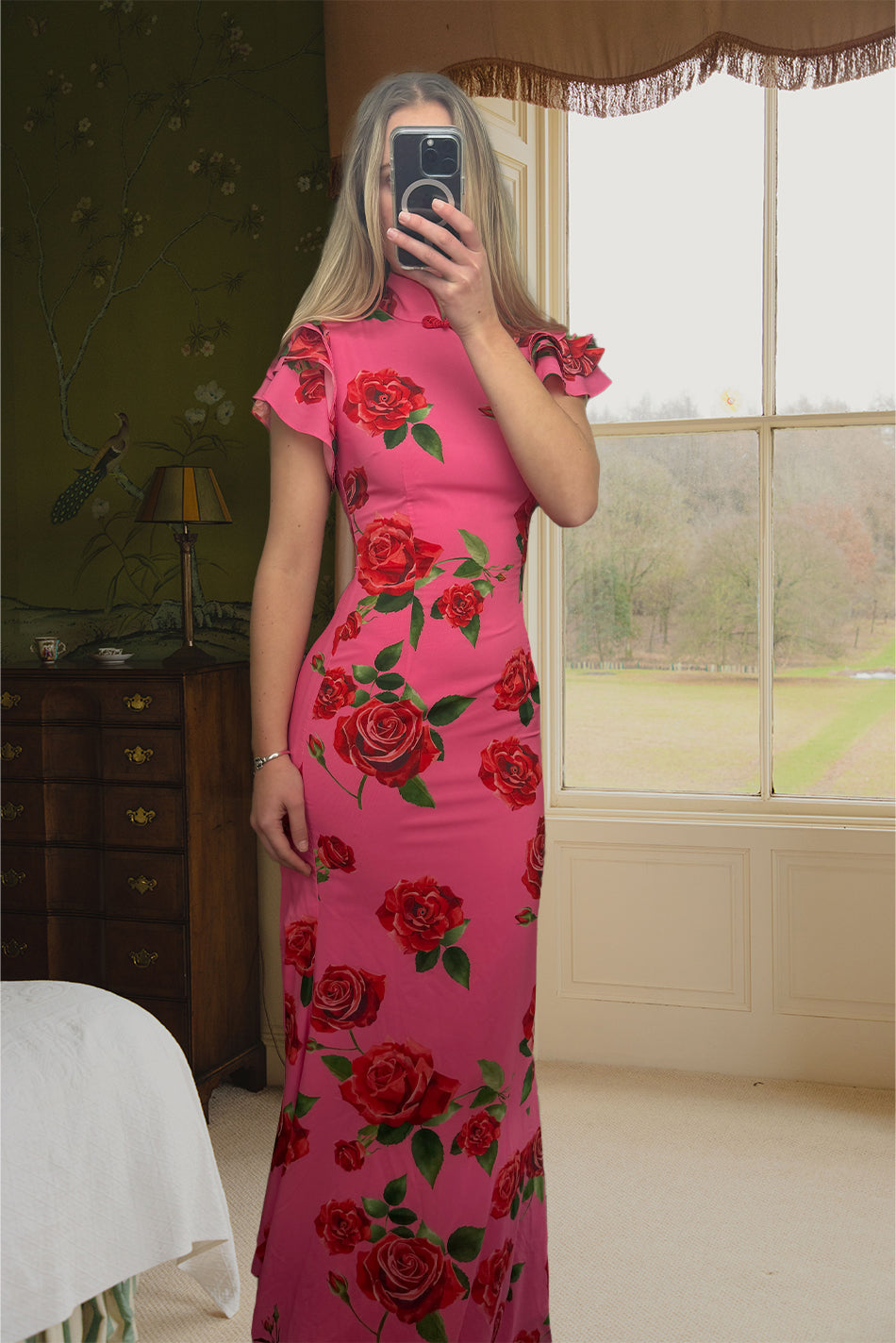 This dress is a statement maxi in a SAU LEE original rose print on stretch fabric. Featuring their signature Mandarin collar with contrast piping and decorative frog buttons at the shoulder, layered ruffle sleeves, and a full-length trumpet skirt.