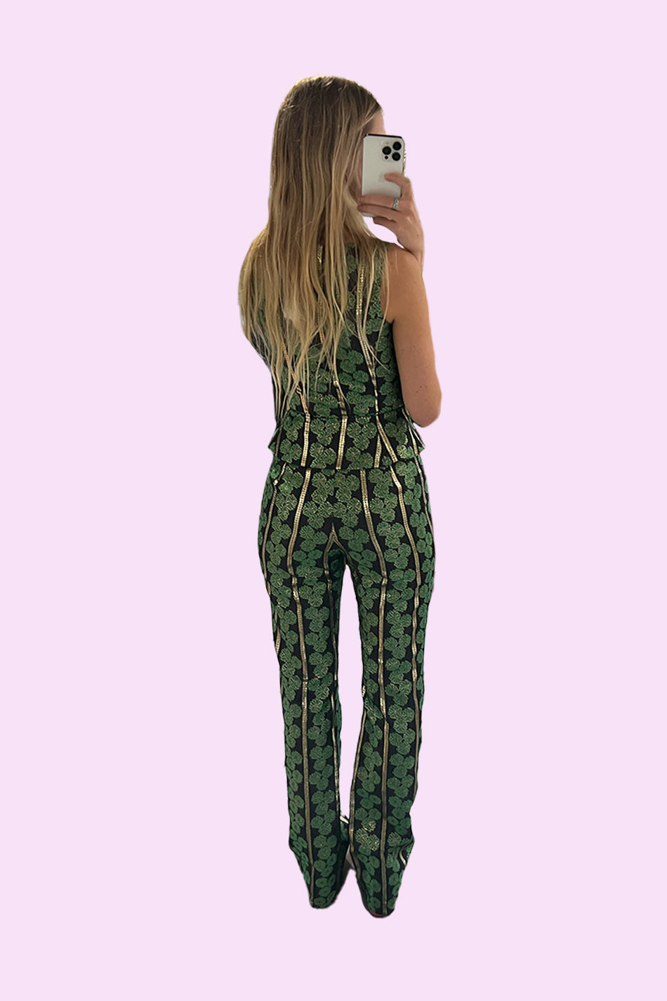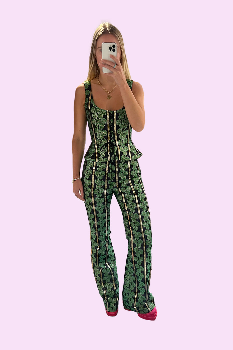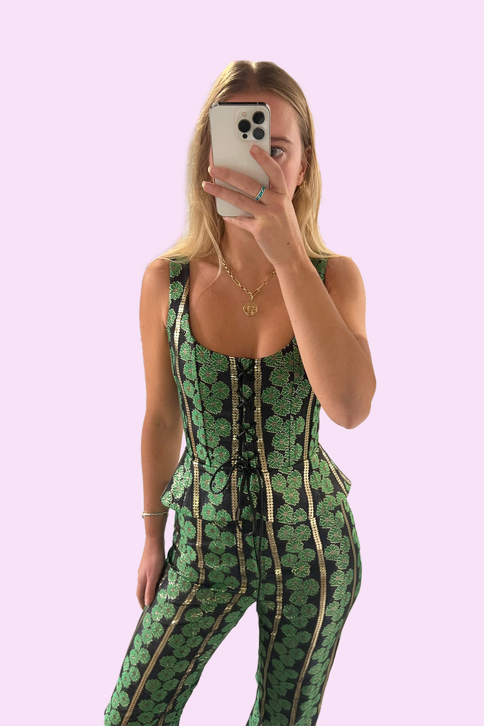 Corset top with lace-up front making the top adjustable size-wise. Paired with slightly flared trousers