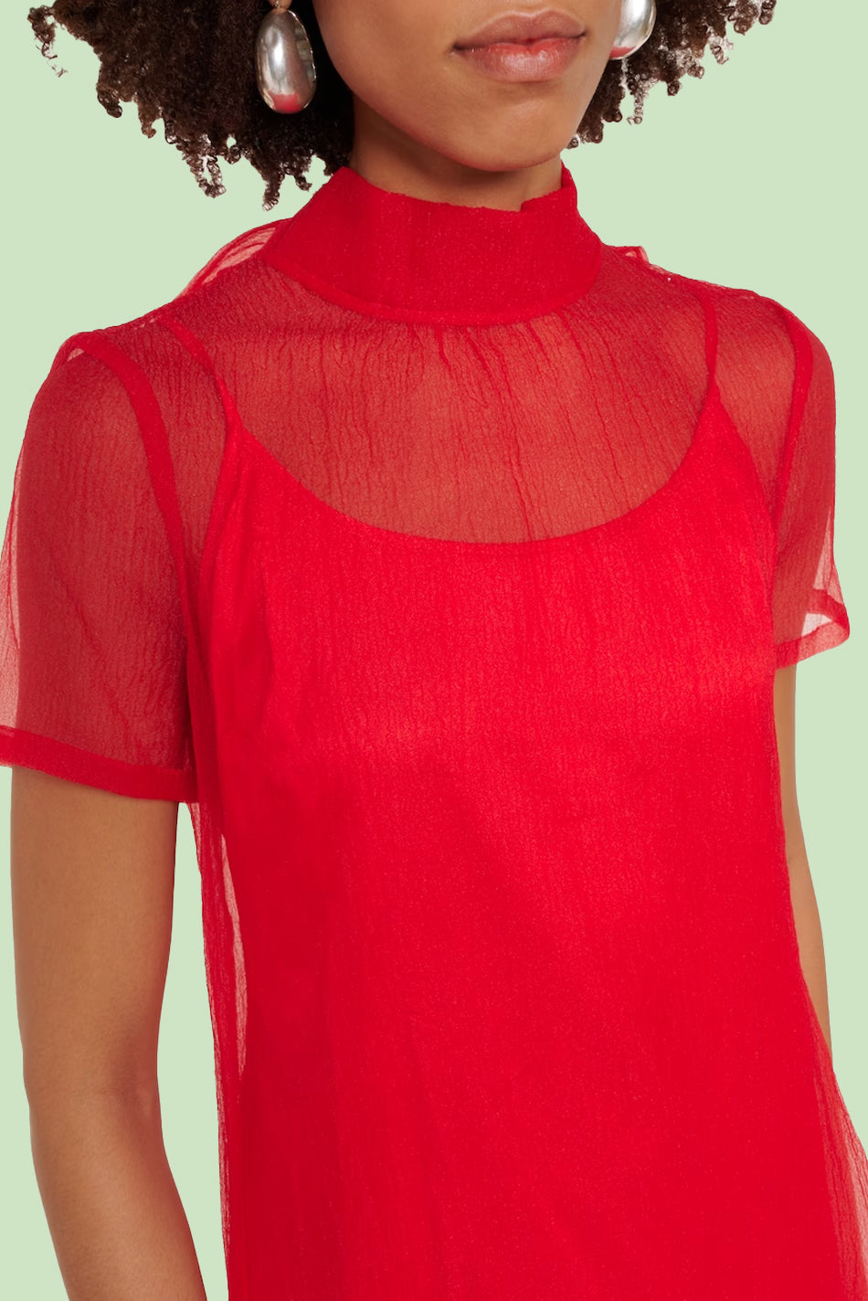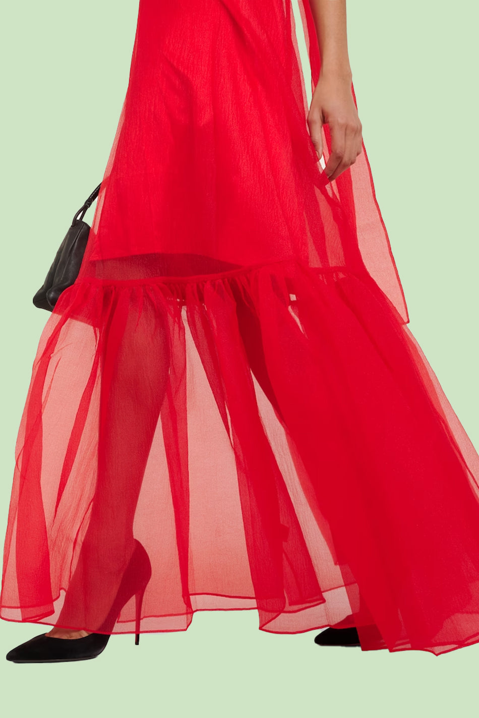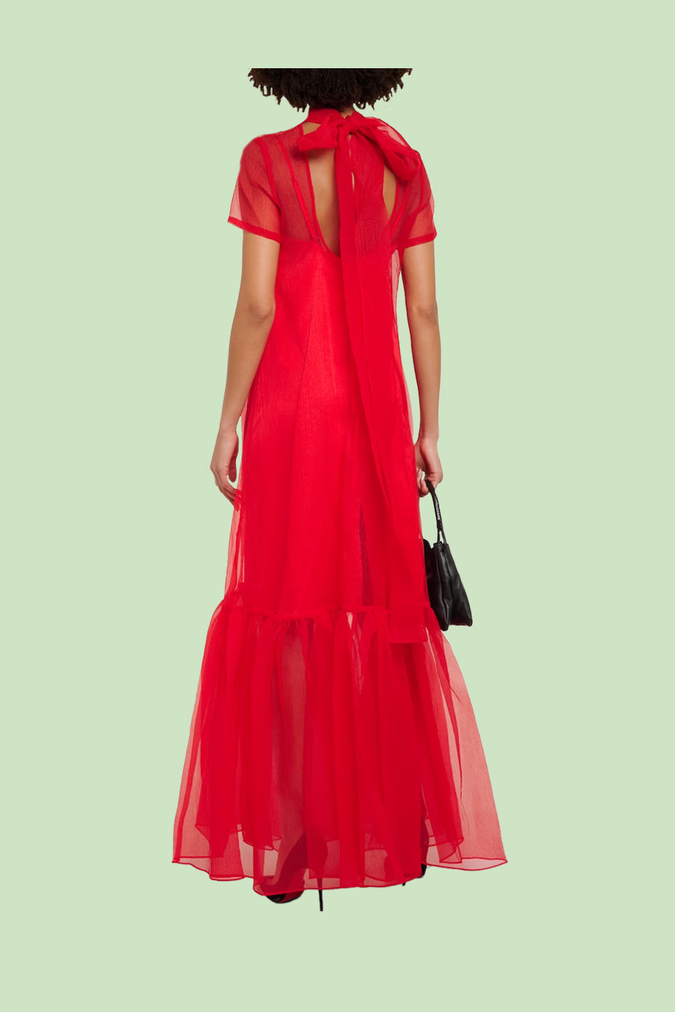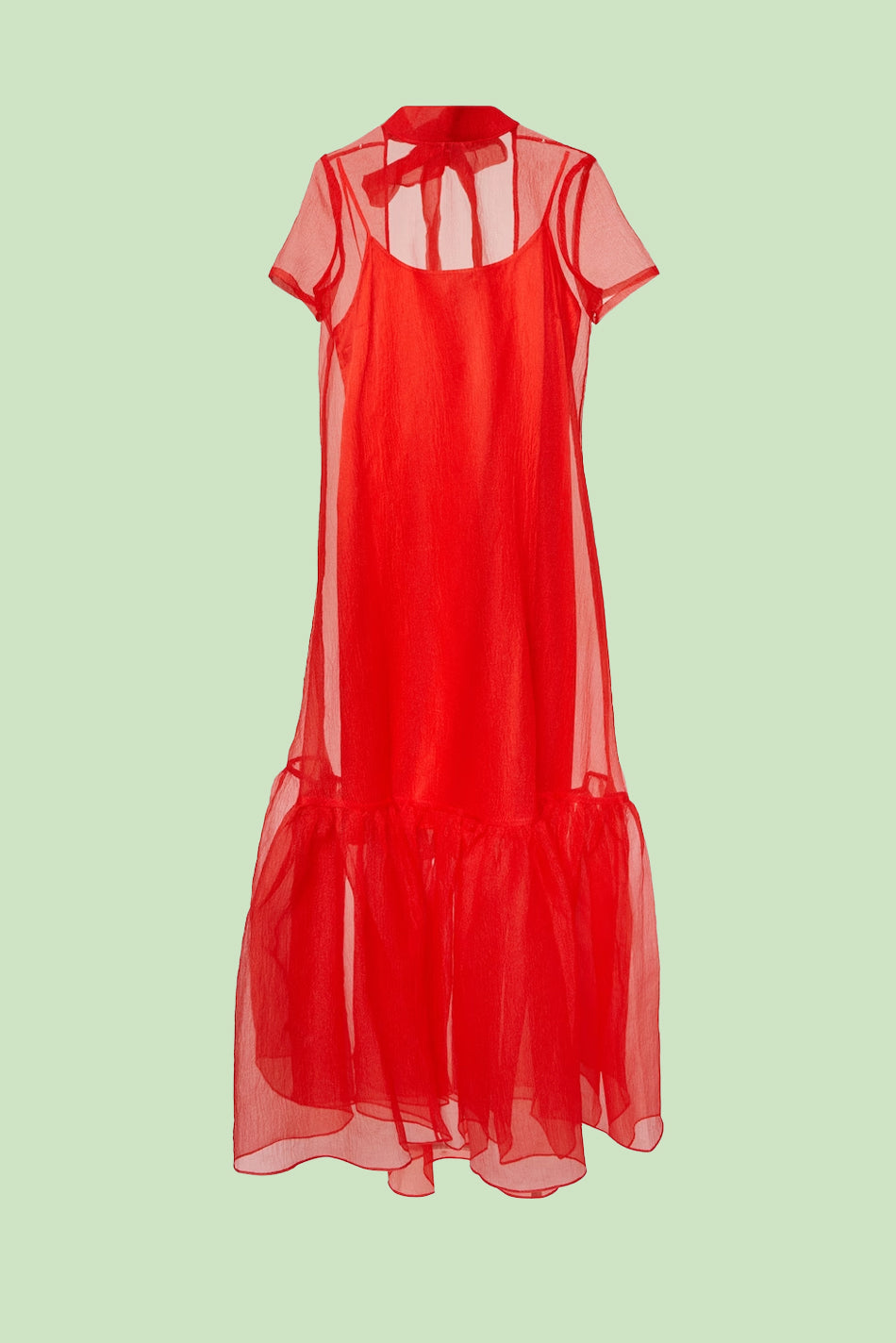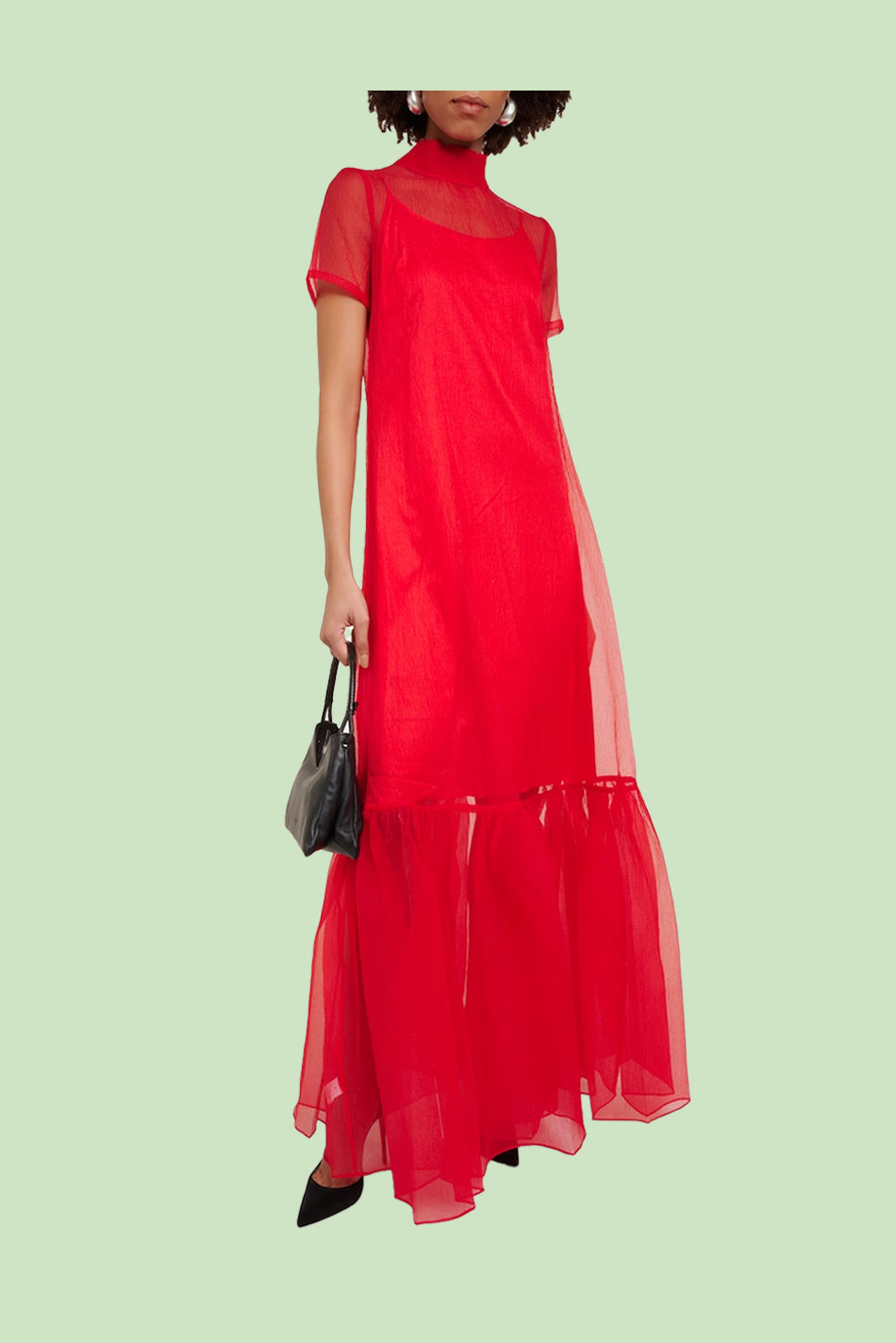 STAUD's dress is reminiscent of glamorous styles from the '80s. Made from sheer organza, it has a high neck with adjustable ties at the back and falls to a voluminous maxi hem. The detachable slip underneath provides the perfect amount of coverage.