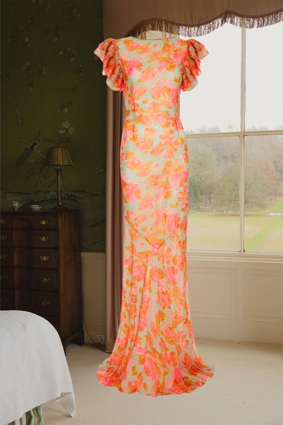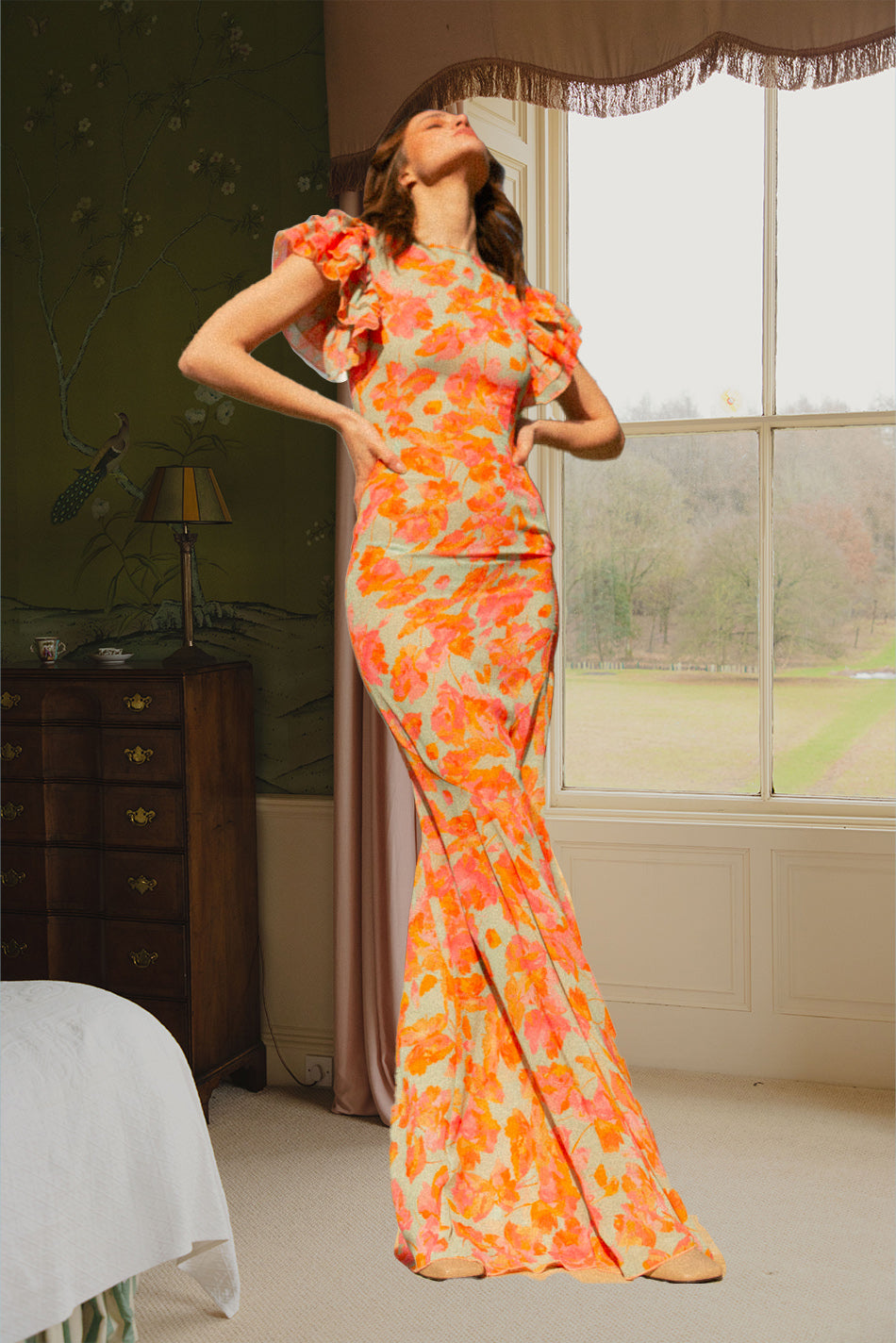 The Bougainvillea Ruffle Maxi Dress is THE dress for the summer wedding season and beyond. In a striking, fluid bias cut silhouette with elegant fishtail hemline and voluminous ruffle sleeve. *There are slight signs of wear on the hem of the dress which are hardly noticeable when on. Feel free to get in touch for photos