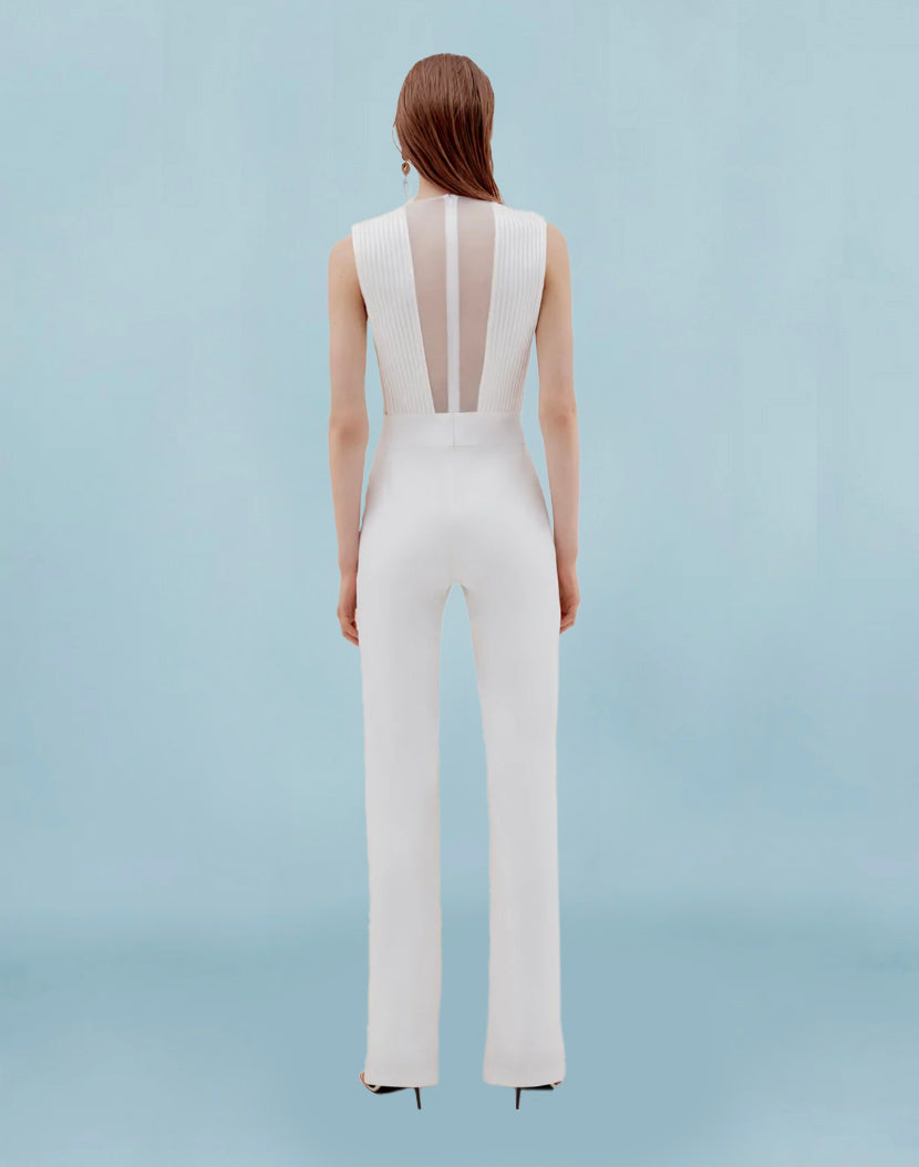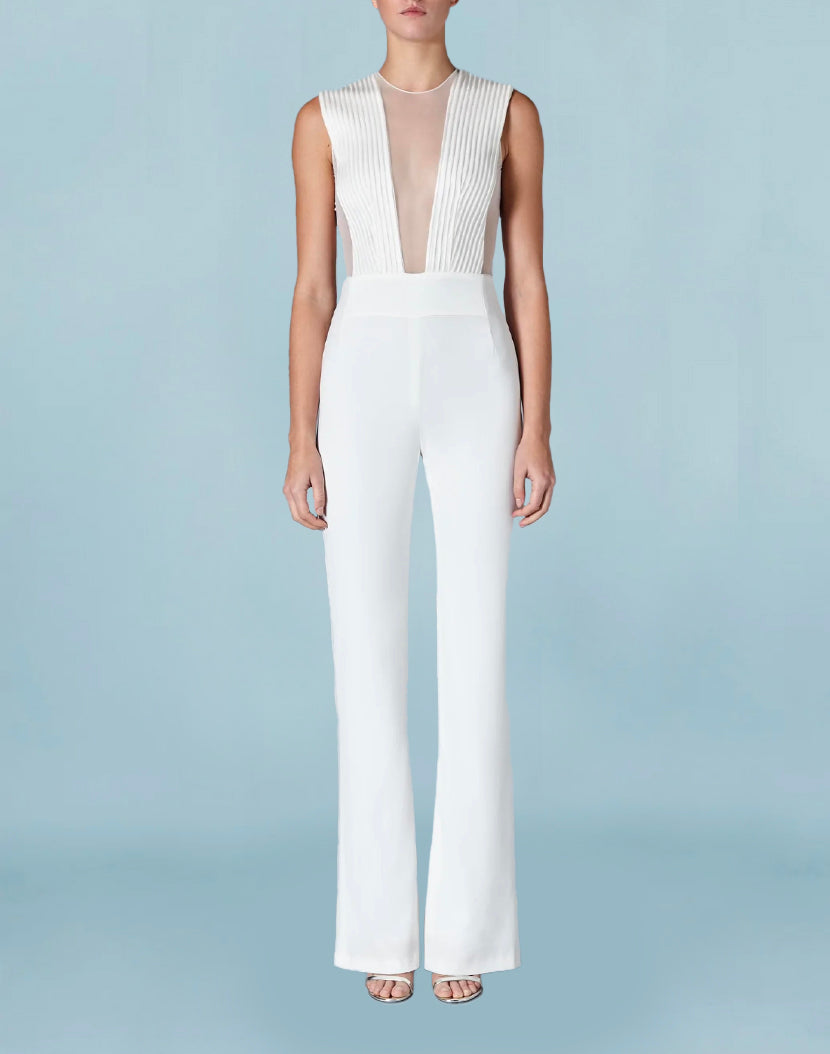 The sheer tulle panels at the chest have stretch and will mould seamlessly to the body. The trousers are fitted across the hips and slightly loose through the leg. Styled to be worn with no bra.