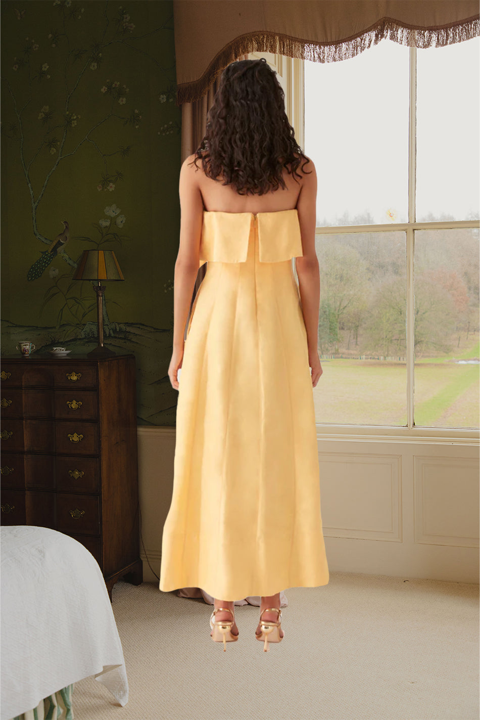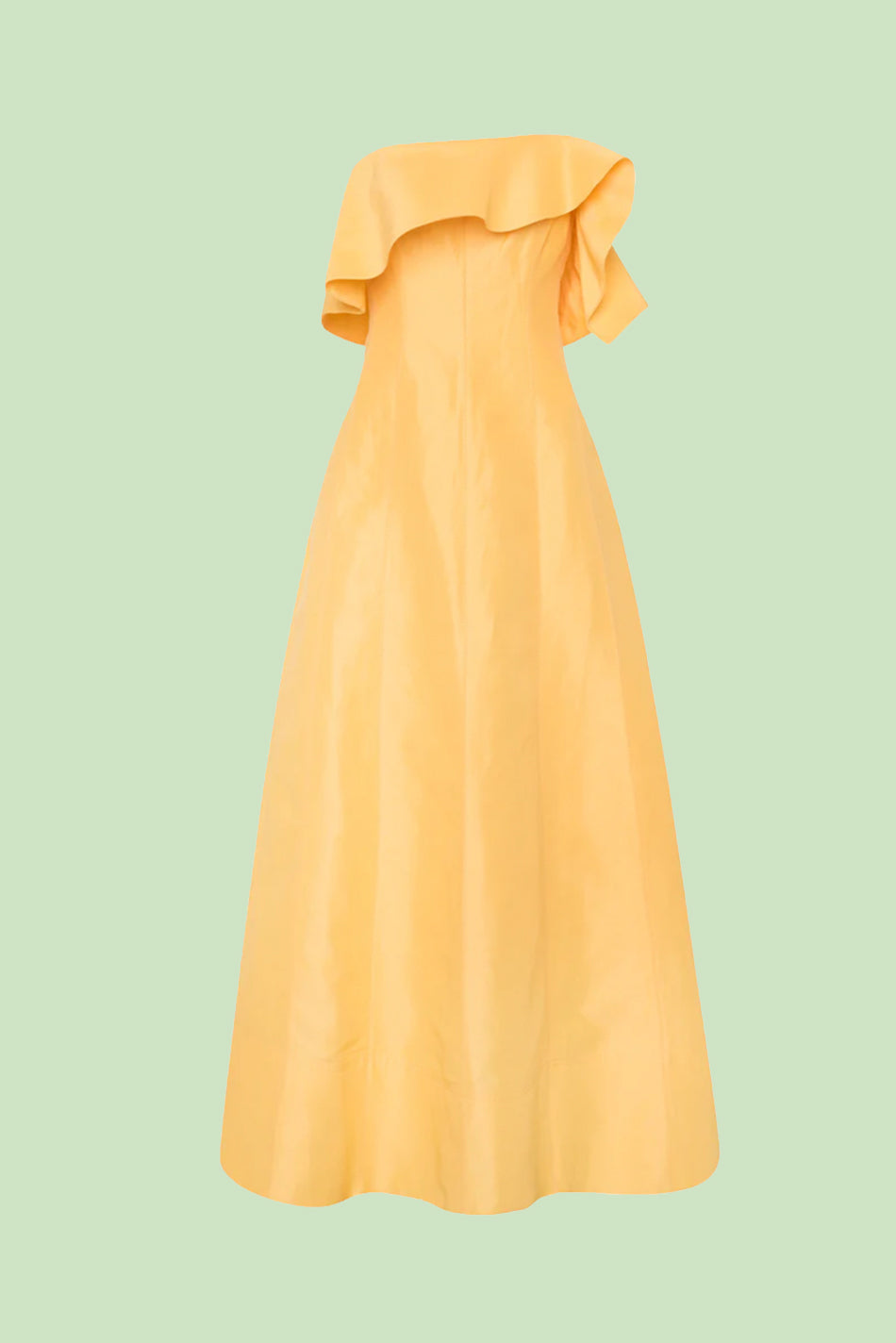 Women’s lined gown with a strapless neckline and asymetrical draped overpay the the neck. Fitted bodice with internal boning, with a side seam and pockets. Zip, hook and eye closure.