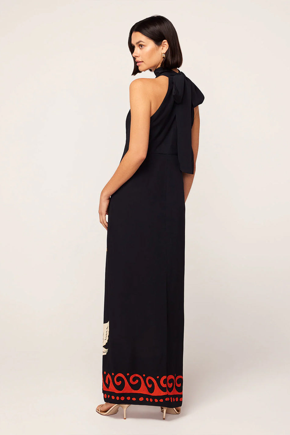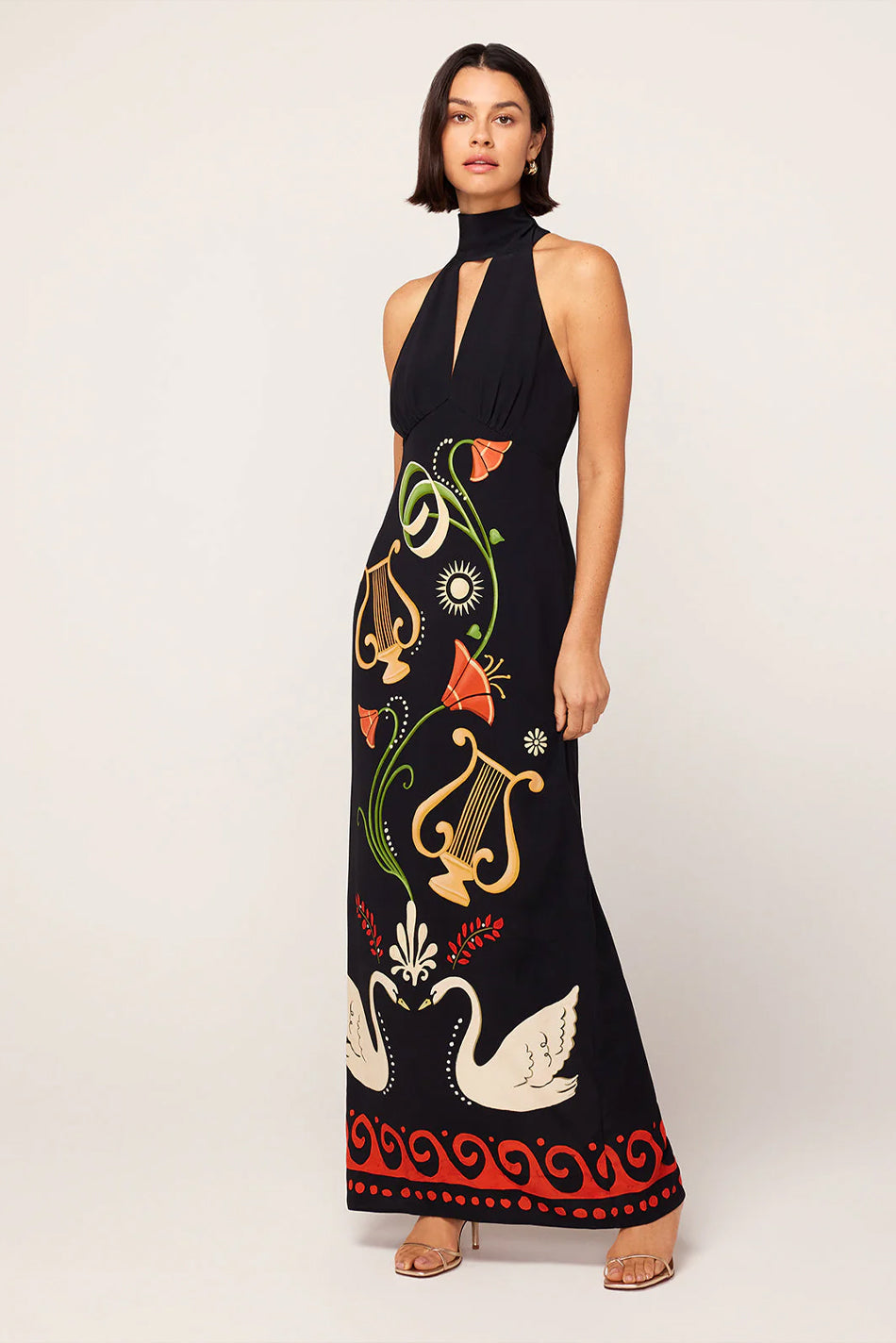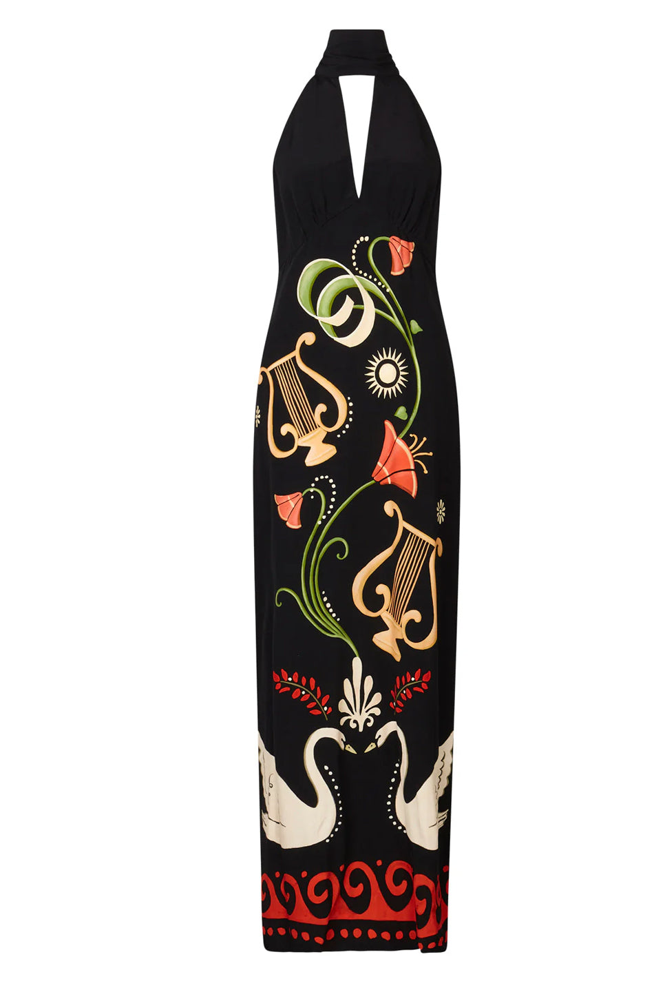 Mythically-inspired Black Cygnus and Lyra motif takes centre stage, and the wave print trims extends fully around her romantic empire skirt. Drawing inspiration from Greek mythology and constellations.