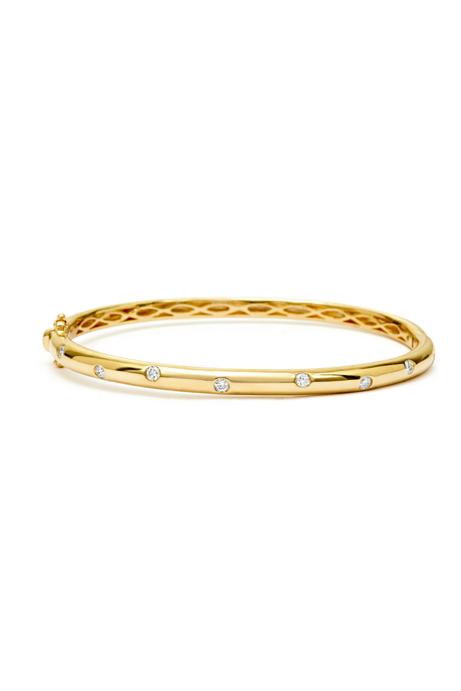 - Metal: 9K Yellow Gold - Diamonds: 0.45ct Dispersed Flush set of G/SI Diamonds - Bangle Size: 60mm wide - Bangle Width: 4mm