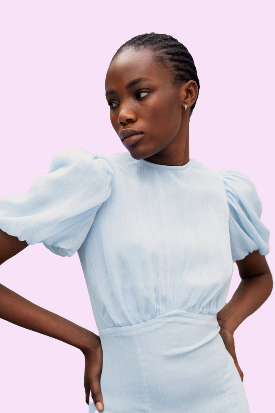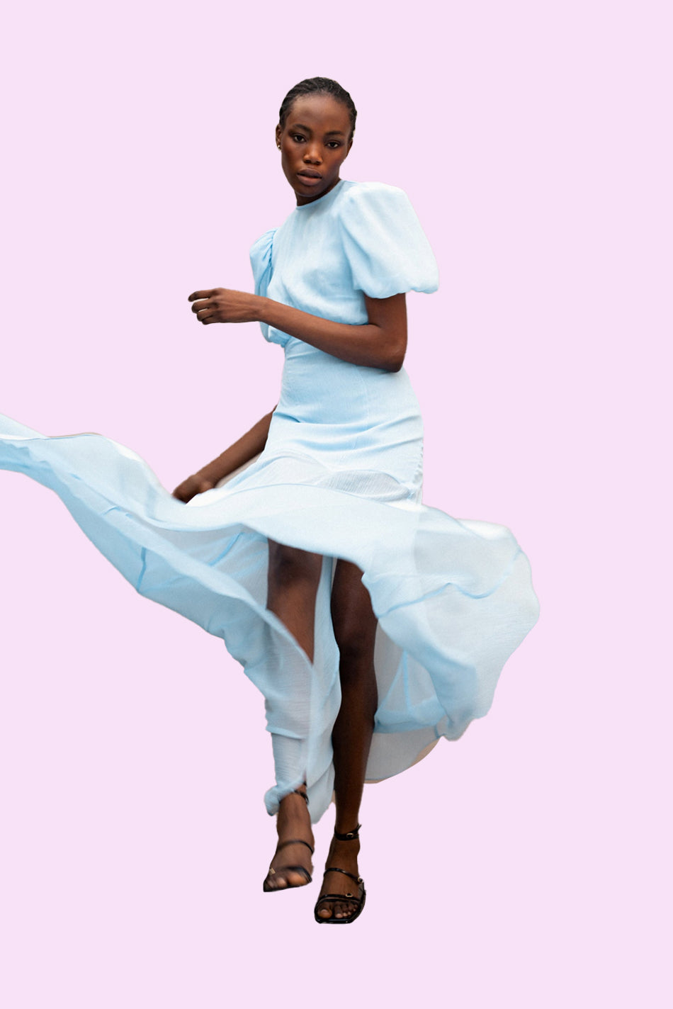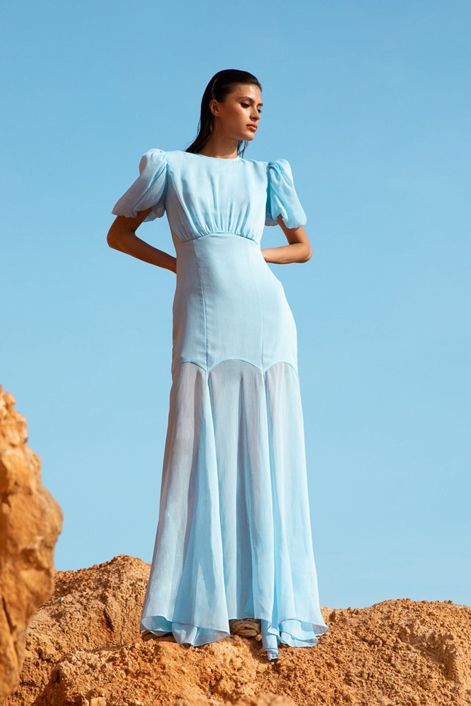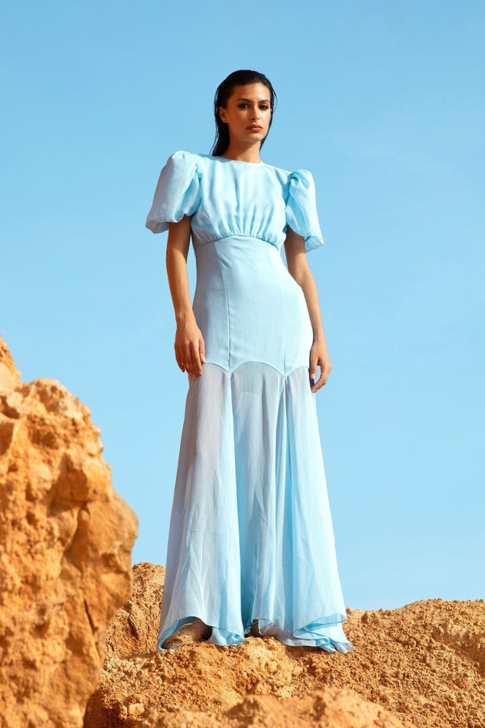 The Agua Maxi Dress in light blue crinkle chiffon showcases a true signature De La Vali gown. This lightweight crinkle chiffon garment boasts a semi-fitted bodice with bust ruching, a fluid fishtail skirt in panels of semi sheer luxe fabric, and voluminous puff sleeves accented with internal organza ruffles to create a dramatic, feminine silhouette.